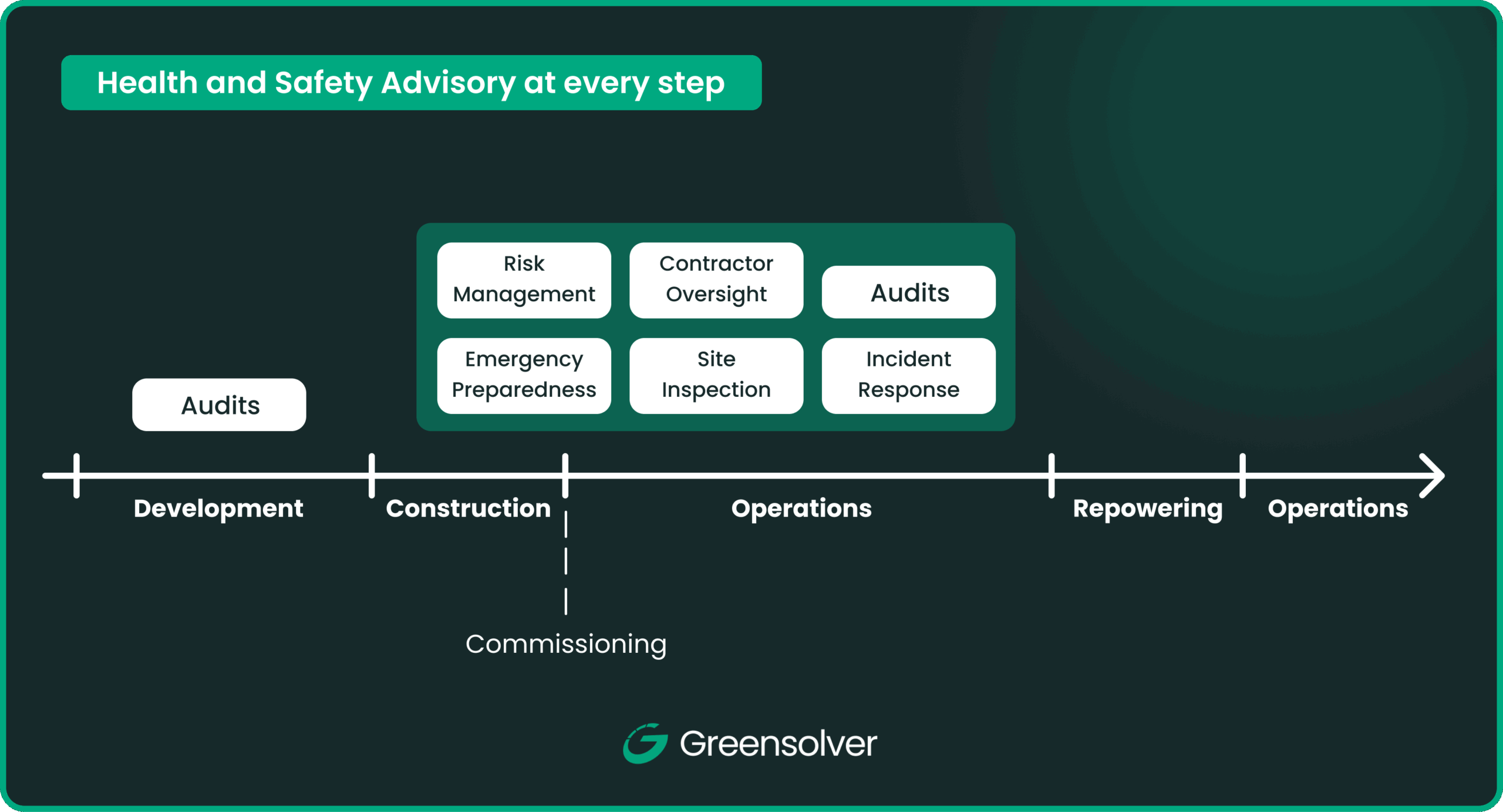 Health & Safety is a critical pillar of renewable energy performance. As wind, solar and BESS portfolios grow, so do their regulatory, operational and contractor-related risks. Greensolver ensures your assets remain safe, compliant and resilient by combining deep field expertise with structured methodologies informed by ISO 45001 and industry best practice. From regulatory compliance audits and site inspections to risk assessments, emergency planning, incident investigation and contractor oversight, we provide independent, practical and proactive HSE management across the entire asset lifecycle. Our objective is simple: protect people, safeguard assets and strengthen long-term operational reliability.